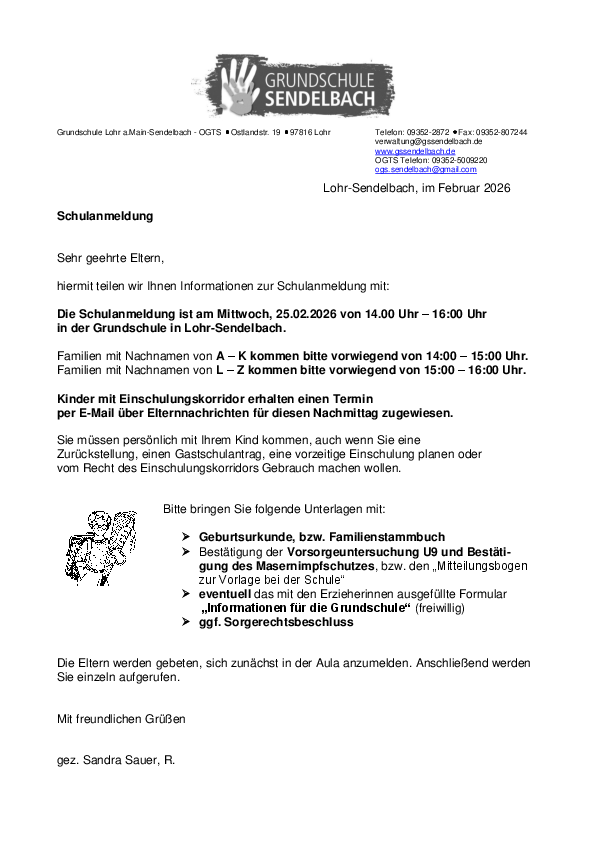 Unsere Grundschule liegt mitten im Ortsteil Sendelbach der Stadt Lohr am Main. Sie ist eine von insgesamt vier Grundschulen, bei der die Kinder der Stadt Lohr den Unterricht besuchen. Einzugsgebiet der Schule sind neben Sendelbach auch die Ortsteile Steinbach, Halsbach, Pflochsbach und Erlach. Hier findet ein kostenloser Bustransfer statt (Busplan). Derzeit besuchen ca. 150 Kinder in 8 Klassen den Unterricht bei uns. Die Nähe zum Spessart, zum Main und zum historischen Stadtkern gibt viele Möglichkeiten, anschaulichen und erlebnisreichen Unterricht zu bieten. Ausgestattet mit einer großen Turnhalle, einem Sportfreigelände und der Anbindung an die Schwimmbäder der Stadt Lohr (Schwimmplan) findet sich viel Raum für Bewegung und Sport.