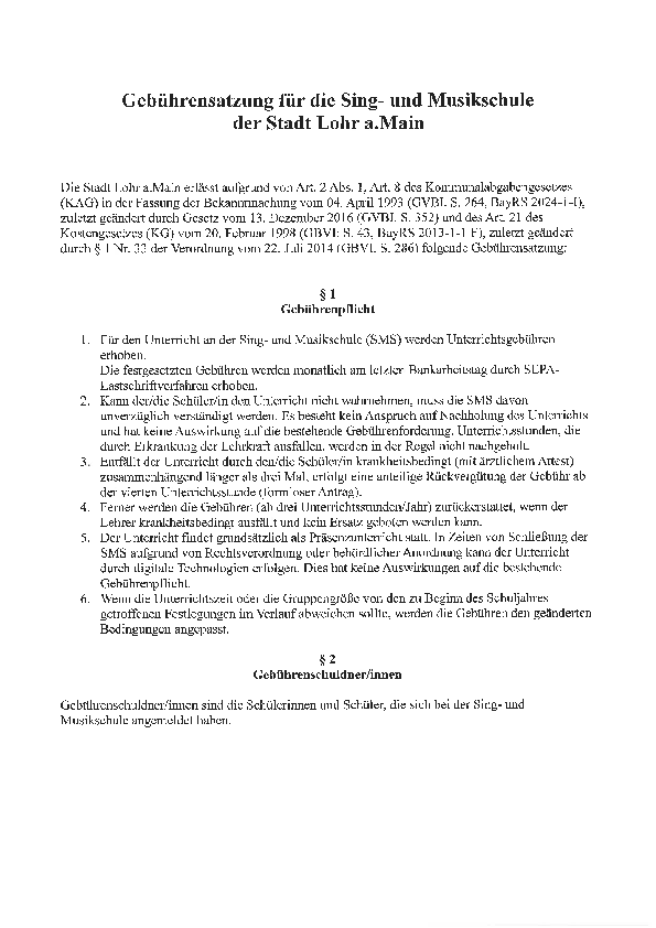 Die Sing- und Musikschule ist eine Weiterbildungseinrichtung der Stadt Lohr a.Main. Die Musikschule hat bildungs-, kultur-, jugend-und sozialpolitischen Aufgaben. Sie ist ein Ort des Musizierens, der Musikerziehung und Musikpflege; ein Ort der Kunst, der Kultur, der Bildung und Begegnung.