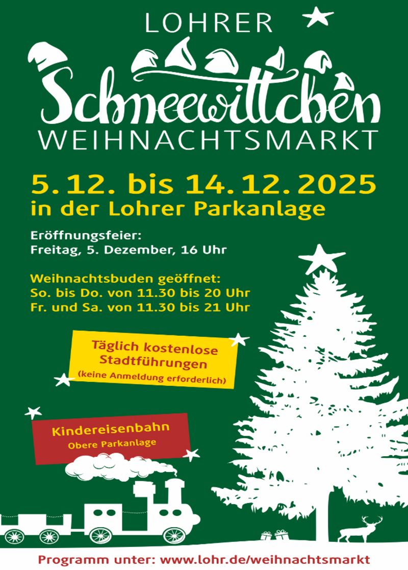 „Glanzvoll“ und märchenhaft präsentiert sich die Vorweihnachtszeit in Lohr am Main, wenn von Freitag, 05. Dezember bis Sonntag, 14. Dezember 2025 der Schneewittchen-Weihnachtsmarkt in der Lohrer Anlage seine Pforten öffnet.